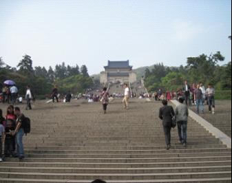 ?? 再往前走就是孫中山先生的紀念碑,約 6 米高, 2 米寬,正面手書“中國國民黨葬總理孫先生于此,中華民國十八年六月一日”二十四個大字,導(dǎo)游解釋說:“孫中山先生屬于黨葬”。背面便是無字碑了,寓意自然是仿武則天“自有后人評說”了,碑體的外面是保護碑體的樓閣,一派威嚴氣象。不久我們就看到了通往墓室的臺階。據(jù)導(dǎo)游介紹,這臺階共392階,代表當(dāng)時全中國3.92億人口,而這些臺階每隔49個設(shè)立一個大平臺,共八個,八是三加五之和,從下向上看時,石階連綿不斷,部件平臺,而朝下看時,卻反而不見臺階,只間平臺,真實奇妙無比。導(dǎo)游說:三暗示 “ 民生、民權(quán)、民主 ” ; 五寓意就有些忘記了,好像是五權(quán)還是什么?我實在是忘記了。這些臺階的設(shè)計真是巧奪天工。佩服!佩服!我不禁佩服孫中山先生的民緣,正應(yīng)了那句古話:“得民心者,得天下!”怪不得人們都稱孫中山先生為中國的“國父”呢!