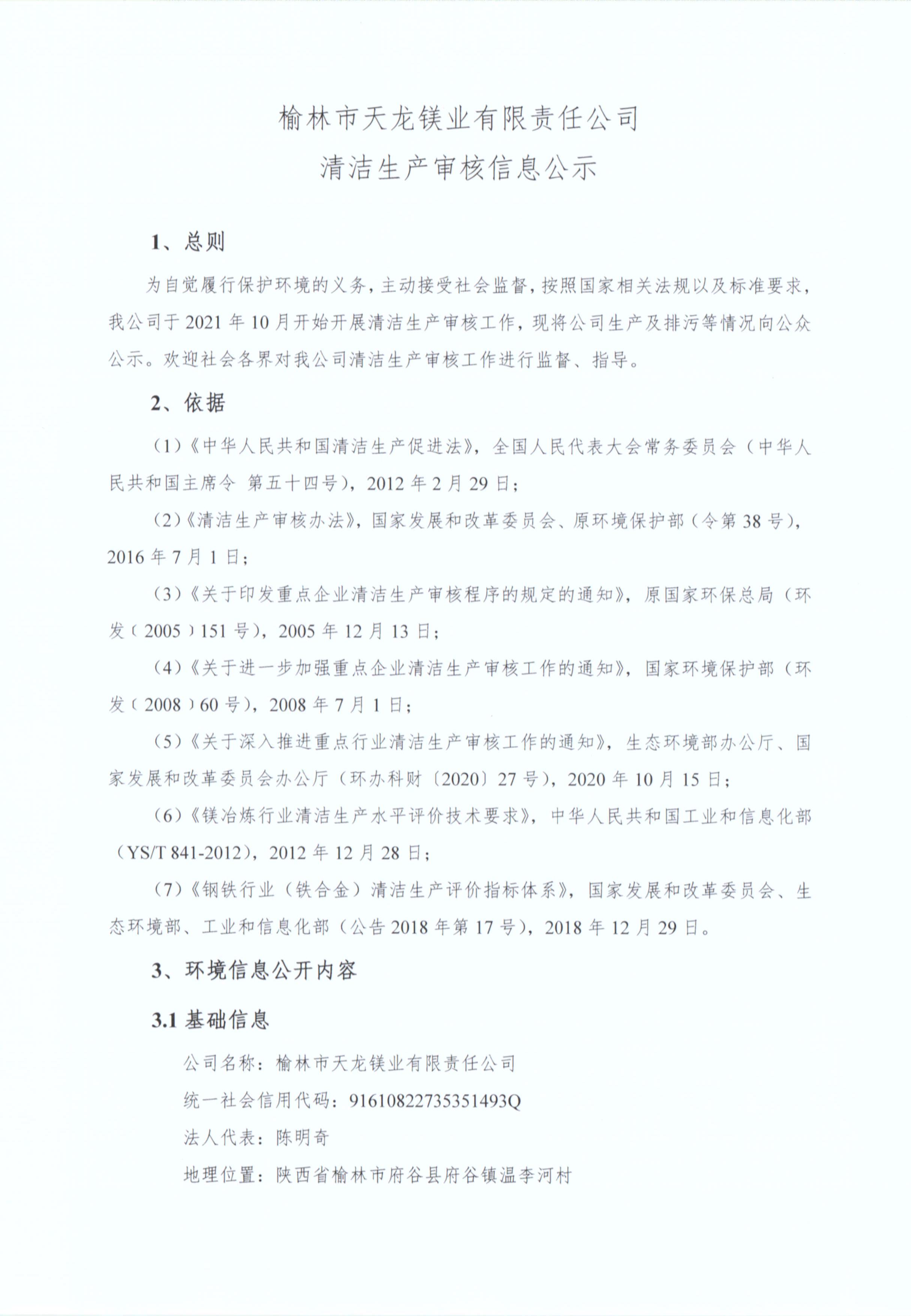 榆林市天龍鎂業(yè)有限責(zé)任公司清潔生產(chǎn)審核信息公示